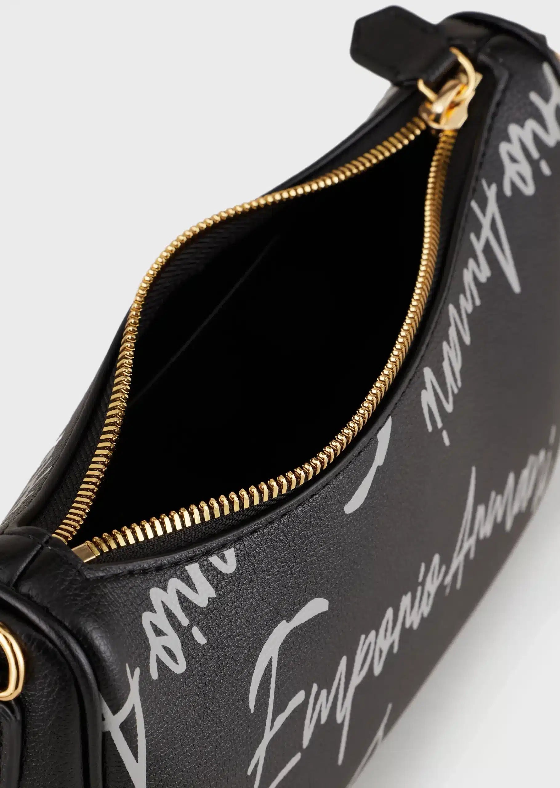 Borsa Emporio Armani a tracolla. Realizzata in ecopelle nera, decorata con scritta bianca.