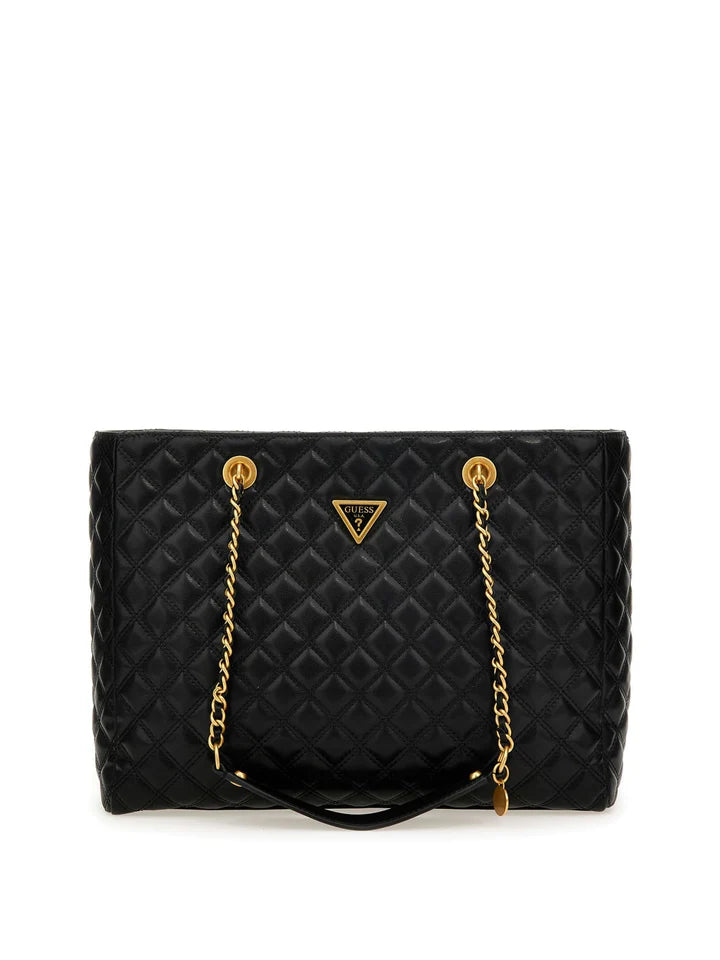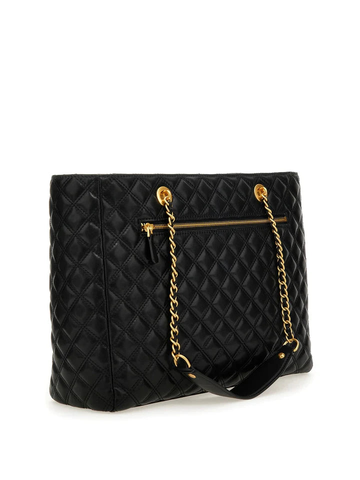 Questa borsa GUESS trasuda raffinatezza con la sua ecopelle trapuntata nera e l'hardware dorato. La chiusura con zip tiene al sicuro i tuoi effetti personali mentre i manici in catena aggiungono un tocco di eleganza. La misura 35x27x12 cm, è la dimensione perfetta per i tuoi oggetti essenziali di tutti i giorni.