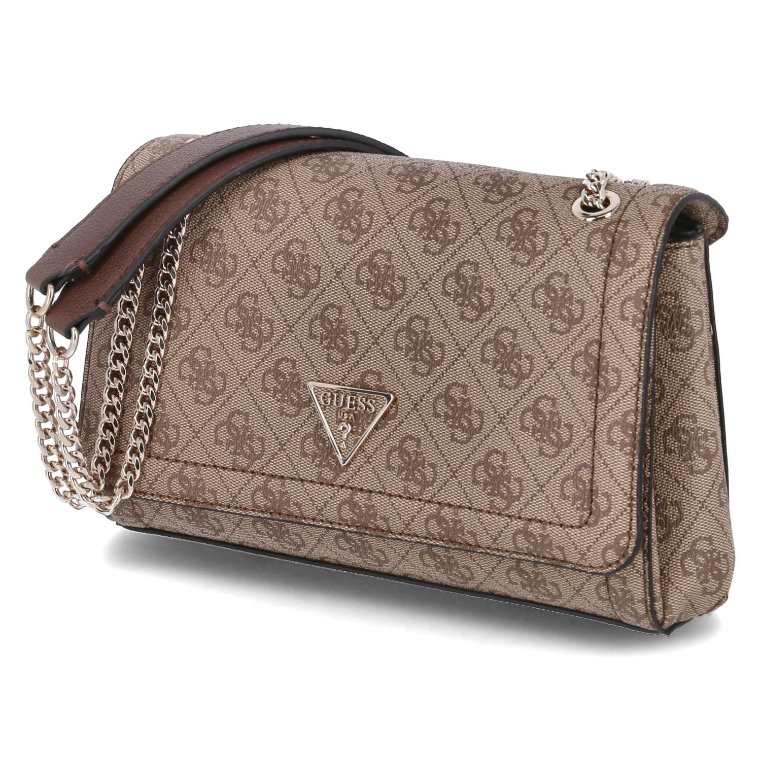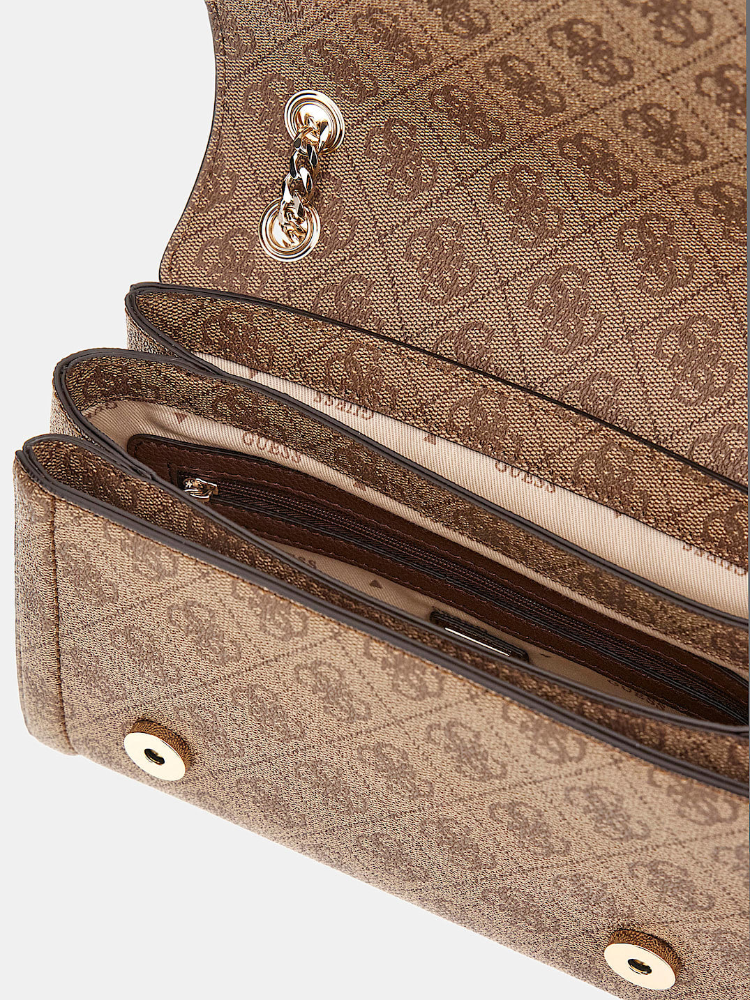 Questa borsa presenta un esterno in similpelle con chiusura a lembo e doppio bottone. L'hardware color oro aggiunge un tocco di eleganza, mentre la fodera con logo personalizzato e le tasche con zip interne ed esterne offrono praticità. Completa di logo frontale in metallo, è un must-have.